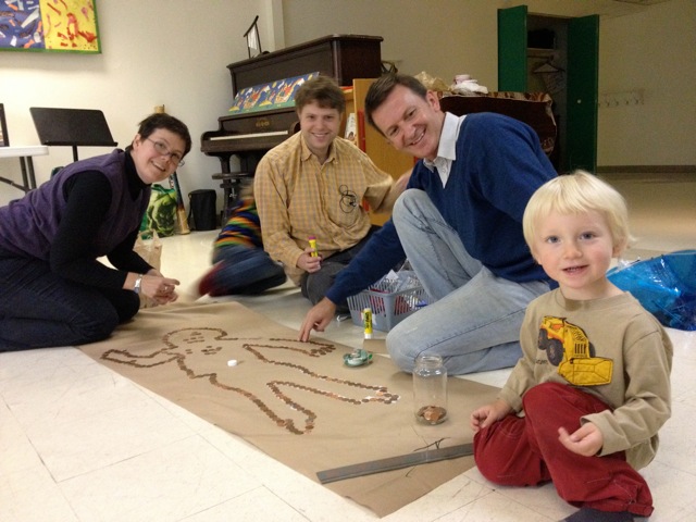 At our Haiti Penny Party the previous day we had drawn outlines around the children’s bodies and then covered the outlines with pennies. This child’s outline needed 250 pennies (picture). It was really 246, but we added on 4 buttons which conveniently rounded it up to 250! $600 is enough pennies to make outlines like this of 240 children!