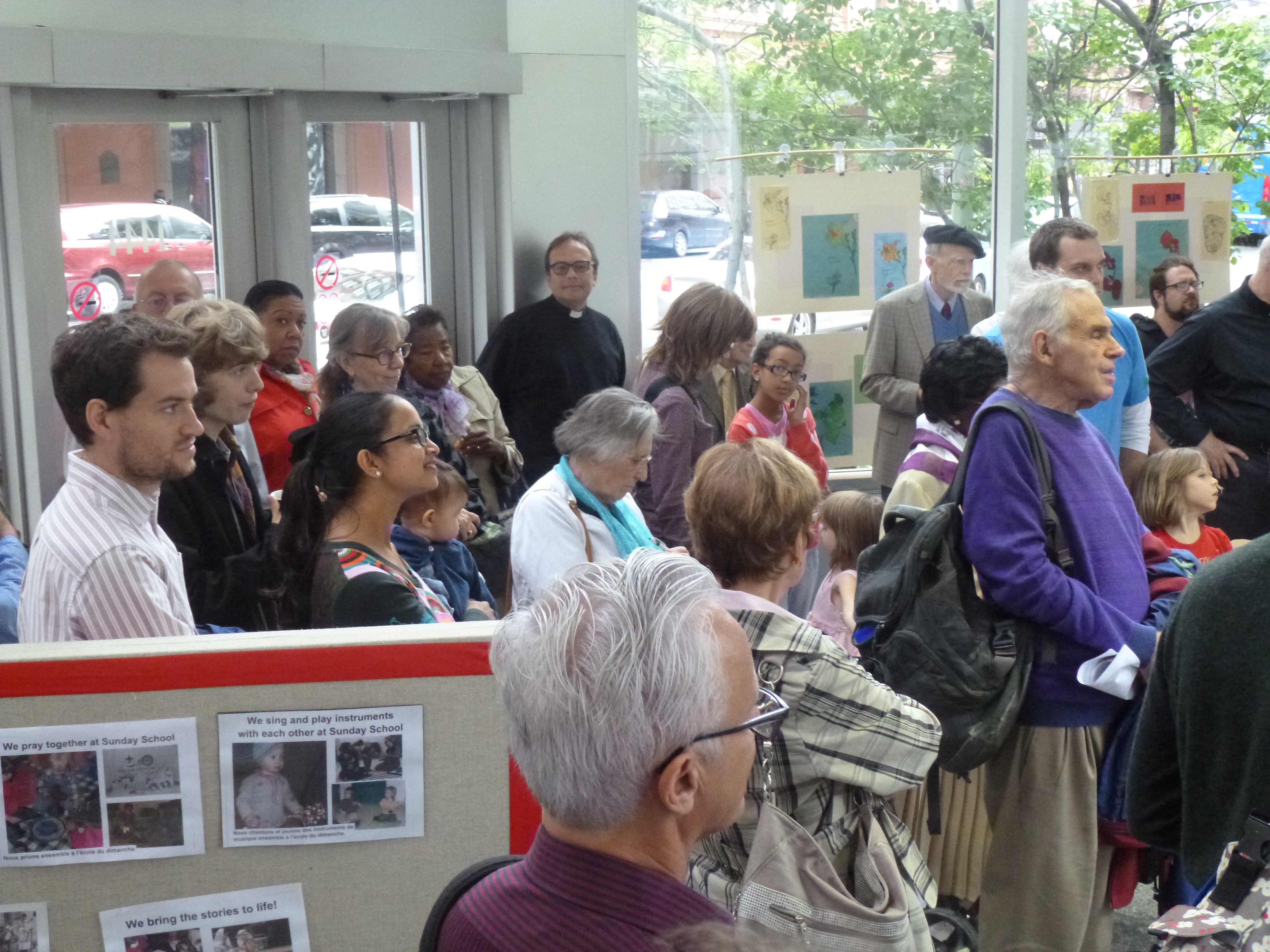 On Sunday, Sept 22nd, an enthusiastic and appreciative group gathered in the Atrium for the opening of the Summer Sunday School Art Exhibition (optimistically called the 1st Annual by our guest speaker!). It was a wonderful, joyous event and the children were thrilled to see their work celebrated by the community. Mark Peacock, a long-time parishioner of Christ Church Cathedral, a devoted art-lover, and a great supporter of Christian education who spent many early Sunday mornings reading Bible stories to his own children in the Children’s Chapel during the 8:00 a.m. service opened the Vernisagge.